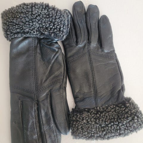 Svarte semskete skinnhansker med saueskinnsfôr inni.