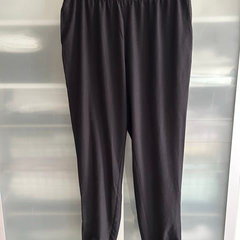 H&M treningsbukse for dame i størrelse 44. Buksen er svart og laget i et lett, pustende materiale med quick dry-egenskaper som transporterer fukt bort fra kroppen. Modellen har strikk og snøring i livet for justerbar passform, samt glidelåslommer i sidene. Egnet til fitness og annen trening, eller som en behagelig fritidsbukse.