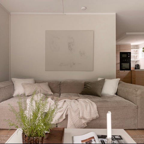 Stoffet på sofaen heter Globa beige, det dyreste og mest slitesterke stofftypen.