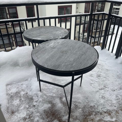 Rundt hagebord med bordplate i strukturert glass og understell i metall. Bordet har svart ramme og fire buede ben som gir god stabilitet. Egner seg godt på balkong, terrasse eller i hage som spise- eller avlastningsbord. Størrelsen passer til et lite sitteområde med et par stoler rundt.
