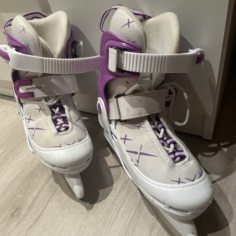 Barn skøyter i justerbar størrelse EU 25–29. Modellen har hard yttersko i plast med to spenner for enkel lukking og justering. Farge rosa med lyse detaljer. Myk innersko for bedre komfort. Egnet til bruk på is for barn innenfor oppgitt størrelsesintervall.