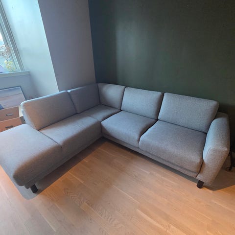 Pent brukt hjørnesofa, selges da det er behov for større sofa. Ble tatt sofarens i 2024, men maskin hjemme. God og konfertable å sitte i. Er en fin sjeselong.