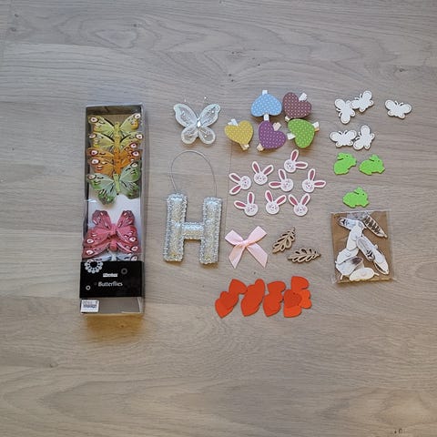 Klistremerker, rød og grønn bølgepapp, 3 rosa piperensere og 13 oransje piperensere.