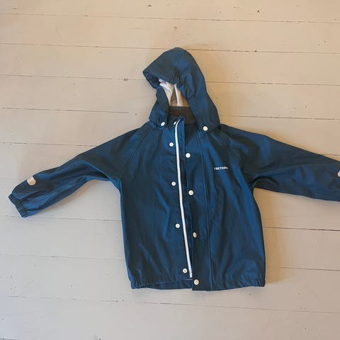 Solid og godt brukt regnjakke, men som fint kan brukes noen år til. Med trykknapper til lukking og på armene, hette med stramming. Produsert på 90 tallet. De ble produsert for å holde noen år, den gang. Se bildene.