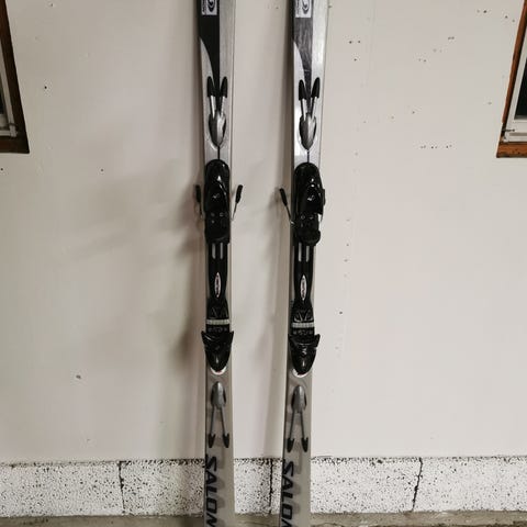 Salomon X-Max alpinski i lengde 110 cm. Skiene har integrerte bindinger med justerbar lengdeskala. Overflaten er gul med svarte og hvite detaljer, såle i svart.
