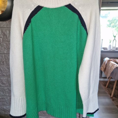 Unik beige genser med et fargerikt, abstraktlandsby- eller husmønster, i flotte jordfarger. Str. XXL. Laget i 80% viskose og 20% polyamid. Pent brukt.