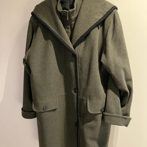 Strøken, mørkblå #kåpe #vintagekåpe #ullkåpe med nydelige, røde detaljer. Store romslige lommer, skjult knepping. Følger med 2 ekstra knapper. Normal str 42. Jeg er str S, så ser garantert mye flottere ut på noen i rett str 😀