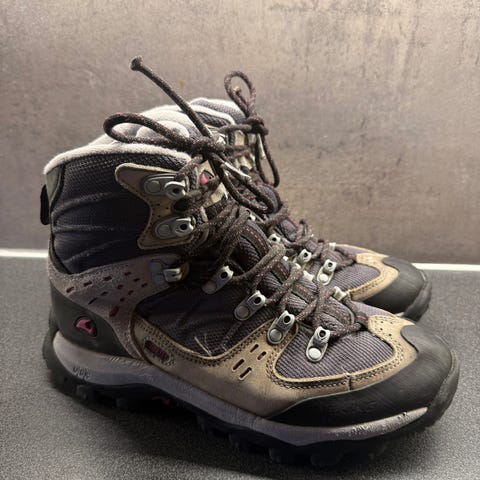 4F tursko støvler i størrelse 39. Modellen er ankelhøy og har snøring foran. Skoene er hovedsakelig svarte med blå detaljer og lyse skolisser. Grovmønstret yttersåle gir godt grep på variert underlag. Egnet som tursko eller fritidssko i ulendt terreng og på turer der det er behov for støtte rundt ankelen.