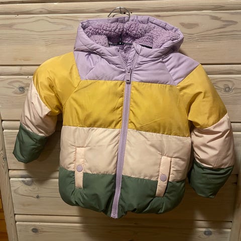 Den har noen bruksmerker se bilde. Jenta mi har elsket denne, får med rosa vinterbukse på kjøpet fra Name It str 110 godt brukt. Kjempe fint sammen.