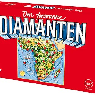 Den forsvunne diamanten brettspill. Klassisk familiespill der spillerne reiser rundt på kartet for å finne den forsvunne diamanten. Spillet passer for flere spillere og kan spilles av både barn og voksne. Inneholder spillebrett og tilhørende spilldeler i henhold til originalt spilloppsett, forutsatt at alle deler er til stede.
