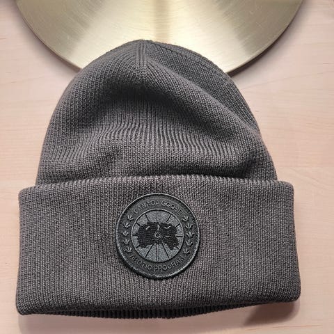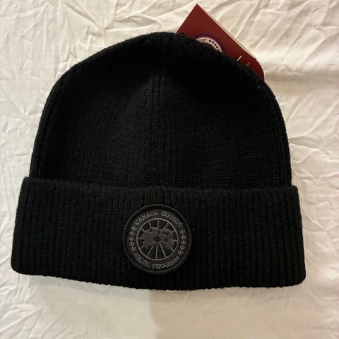 Canada Goose lue i svart farge. Luen er strikket i ull og kommer i størrelsen one size. Den har oppbrettkant og rund logo-patch foran. Passer til menn, men kan også brukes unisex. Egnet til hverdagsbruk og utendørsaktiviteter i kaldt vær.