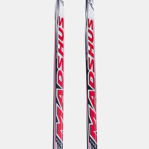 Madshus langrennsski med Rottefella-bindinger og tilhørende skistaver. Skiene har smøresone/fellesone under sålen slik det fremgår av bildene. Farge hovedsakelig blå med svarte detaljer. Lite brukt.