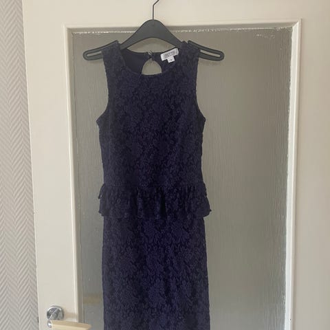 WOW Fest kjole for jente i størrelse 152 med svært fine detaljer. Kjolen er blå og laget i polyester innvendig og bomull innvending. Den har et tettsittende snitt med blondelignende struktur i stoffet og en liten peplum-detalj i midjen. Glidelås i ryggen for enkel av- og påkledning. Passer til bruk ved ulike anledninger der man ønsker en enkel, pen kjole. Det har vært brukt kun 1 gang. Den er så å si helt ny.