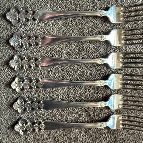 Vidar kakegaffel i sølvplett med lengde på ca. 15,3 cm. Gaffelen har tre tinder og dekorert skaft. Egnet til servering av kaker og desserter. Selges som sett, antall fremgår av bildene.