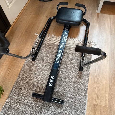Romaskinen har sete som glir på en skinne, fotstøtter med stropper og håndtak foran.