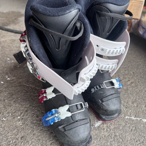 Tilstand og alder: De ser ut til å være i grei stand ut fra bildet (ikke veldig slitt såle eller kanter synlig), men de er 10–15 år gamle. Bindingene (ser ut som eldre Look eller Dynastar/Look-system) bør sjekkes av fagperson for DIN-innstilling og sikkerhet før bruk – gamle bindinger kan miste elastisitet og ikke løse ut riktig.