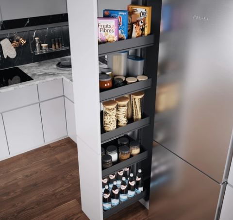 Fire overskap fra epoq i lys grå farge. Skapene har glatte fronter med rette håndtak og flere justerbare hyller på innsiden for oppbevaring av kjøkkenutstyr, matvarer eller servise.
