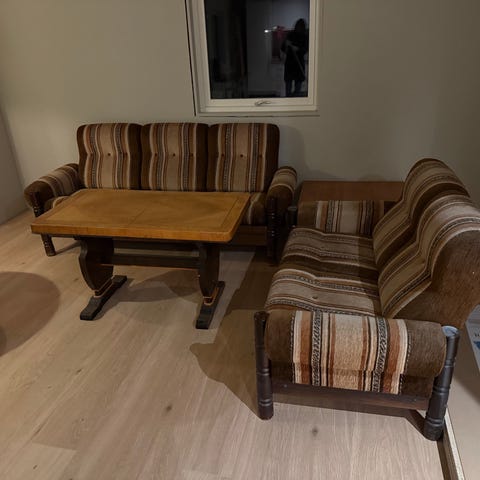 Jeg gir bort to skinnsofaer.