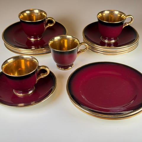 Den ene koppen har noe riper i bunn og den ene skålen noe skjolde i glasuren (se bilde) På ingen måte skjemmende og kun synlig om man studerer det.