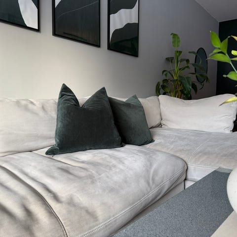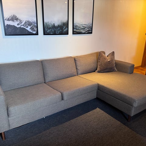 Stor grå sofa med sjeselonger og nakkestøtte. Selges billig grunnet flytting, mot henting 15.februar. Den kan fraktes i flere deler.