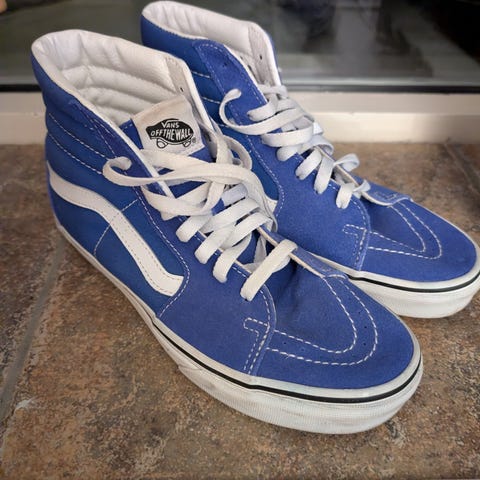 Vans Sk8-Hi sneakers i størrelse 39. Høye skatesko med overdel i tekstil og semsket materiale. Rød farge med rutete og flammeinspirert mønster på sidene, hvite lisser og hvit sålekant. Klassisk Vans yttersåle i gummi med vaffelmønster for godt grep. Passer til hverdagsbruk og fritidsaktiviteter. Ubrukt i esken.