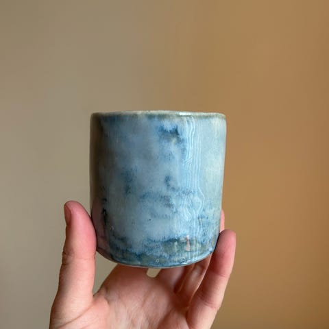 Liten keramikkkopp i blågrønne nyanser.