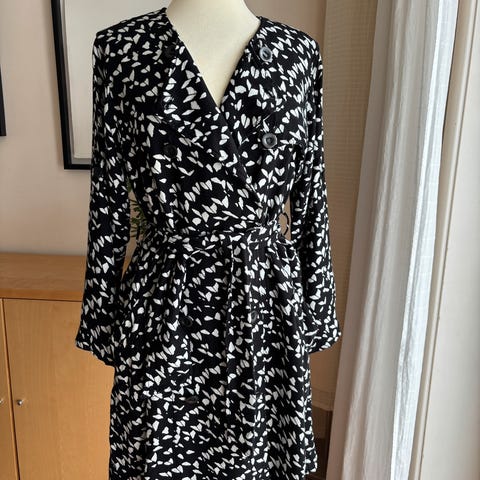 Selger en ubrukt kjole fra Vila i størrelse 36. Kjolen har esort/beige mønster, V-hals og lange ermer med lett volum. Den har knytebelte i livet som gir fin fasong. Aldri brukt.
