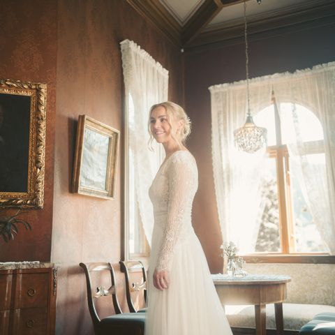 Pronovias brudekjole i størrelse S. Kjolen er i mikado. Modellen har lange ermer, markert midje og hel, vid skjørt med slep. Lukkes med knapper i ryggen. Passer som klassisk brudekjole til bryllup i kirke, rådhus eller andre formelle anledninger.