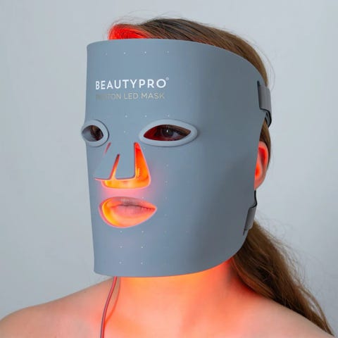LED ansiktsmaske i hvit plast. Masken dekker hele ansiktet og har utsparinger for øyne, nese og munn. Den har innebygde LED-lys i flere farger og kobles til med medfølgende kabel. Egnet til bruk som hudpleieutstyr i hjemmet.