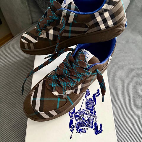 Inspired by vintage basketball styles, the Area Lo Trainers are handmade in Portugal from a combination of leather and a recycled polyester, produced using reclaimed PET bottles. This model is designed with a strap over the lacing that incorporates the classic gold-plated Mulberry lock. Available in Green, Blue, and Brown colorways.