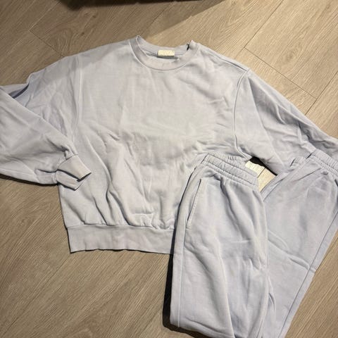 Muse joggedress sett for dame i størrelse M for overdel og L i bukse. Lene orvik sin kolleksjon. Sett med genser og bukse i hvit bomull. Genseren har rund hals og ribbestrikkede mansjetter og linning. Buksen har strikk i livet og rette ben. Mykt, børstet materiale på innsiden gir en behagelig følelse mot huden. Egnet som hverdags- og loungewear.