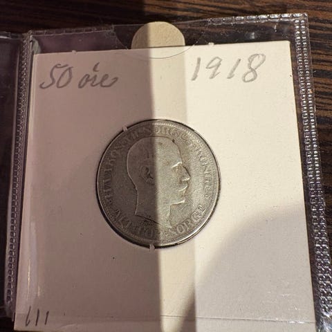 Norge 50 øre mynt fra 1923, hullmynt skjoldmotiv. vurdert kvalitet 1+