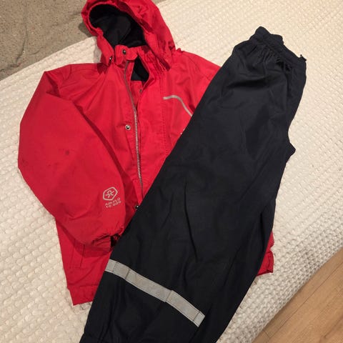 Molo regnsett for gutt i størrelse 134. Sett med jakke og bukse i polyester med flerfarget mønster. Jakken har hette og lukking foran. Buksen har strikk i livet og fotstrikker nederst. Materiale: polyester. Passer som yttertøy i vått vær. Nypris 935 kr.
