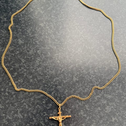 Meget flott halskjede i gull ca 14g kjede 9g og kors 5g