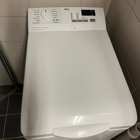 Hvit AEG toppmatet vaskemaskin. Egnet for plassering i mindre rom der det er behov for en smal vaskemaskin som åpnes fra toppen. Maskinen kobles til vanlig vann- og avløpstilkobling og standard stikkontakt for strøm.