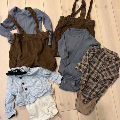 Cardigan, skjortebody, to sløyfer og bukse med seler.