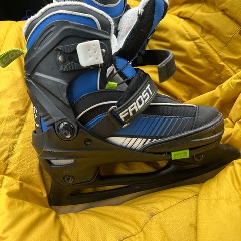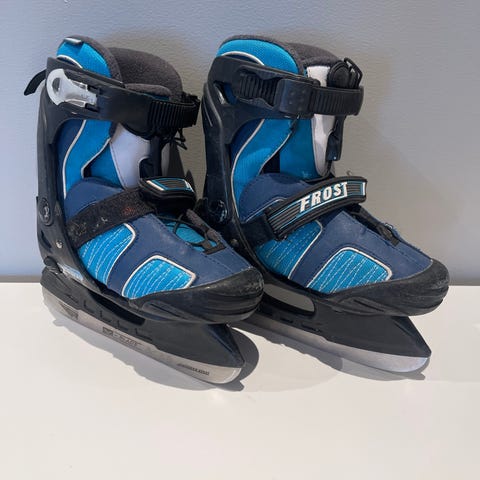 Frost justerbare ishockeyskøyter for barn i størrelse 36. Skøytene har hard yttersko i plast med justeringsmekanisme som gjør at størrelsen kan tilpasses innenfor området som er markert på skøyten. Overdelen er i tekstil og syntetisk materiale i blå og svarte toner, med borrelåsrem og spennelukking for stabilitet rundt ankelen. Egnet til ishockey og generell bruk på is for barn i aktuell skostørrelse.