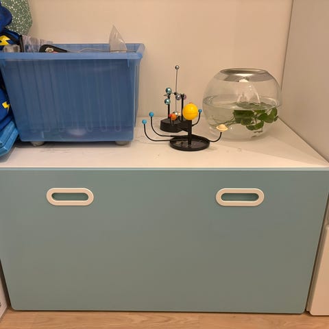 Busunge skap fra IKEA, med heng øverst og hylle nederst.