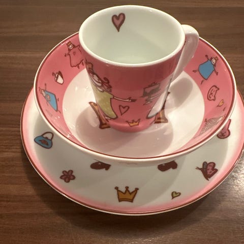 Flott hverdagsservise for en liten prinsesse. Lett slitasje på fatet og lite hakk i bunnen av koppen, knapt synlig. Mye bruk igjen!