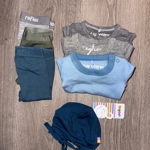 Ullklær i merinoull i størrelse 50/56 selges samlet. Klærne er kun brukt i ca. én måned og er i god stand.