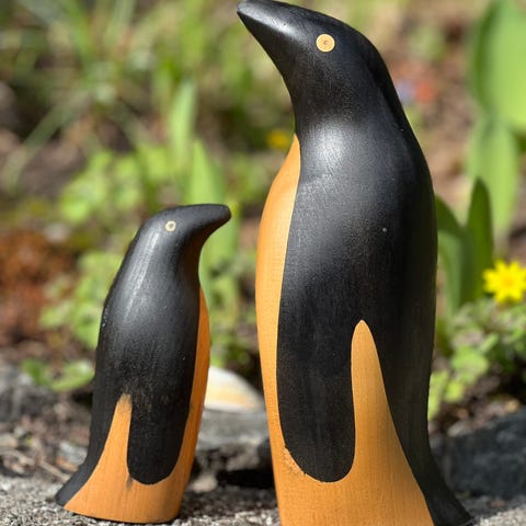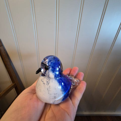 Glasspingvin + dompap i glass – selges samlet