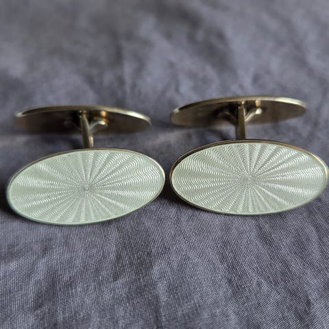 Emaljen fremstår hel og blank uten riper eller nagg, og settet er velholdt med kun små, normale bruksspor i metallet. Dette er en tidløs type vintage mansjettknapper som passer like godt som en gave som til egen garderobe, og som løfter helhetsinntrykket med diskret kvalitet.