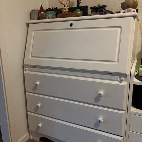 Godt brukt kommode. Skuff øverst må skrus til. Ellers hel.