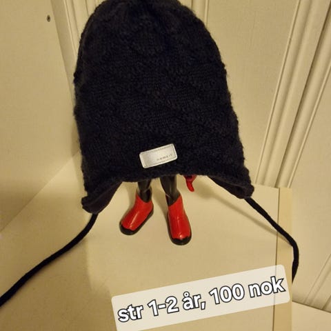Luen er strikket i ull og har knyting under haken for bedre passform.