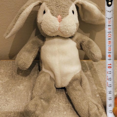 Kosedyr formet som en stripete tiger med lys brun og beige farge. Tigeren har rosa detaljer på snute og ører, samt en sløyfe rundt halsen. På magen er det en liten lomme med en avtakbar liten kosedyr-mus. Myk plysj som egner seg som koseleke for barn.