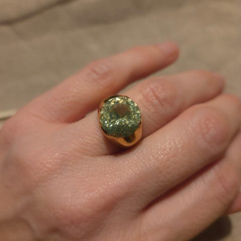 Designet er en tradisjonell signetring med en oval eller rund stein fattet i en glatt gullramme.