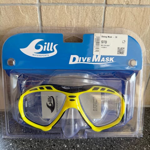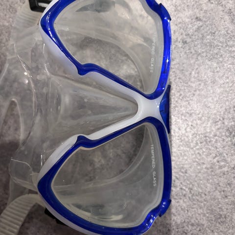 Dykkermaske i blå farge med klart glass. Masken dekker øyne og nese og har justerbar stropp bak for tilpasning til hodet. Egnet til snorkling og enkel dykking i basseng eller sjø.