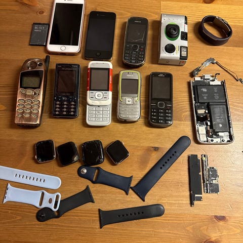 Apple iPhone mobiltelefon. Modellen tilhører serien iPhone 2G–11. Enheten er en smarttelefon som kan brukes til tale, meldinger, internett og apper. Flere eldre mobiltelefoner fra andre merker følger med, som vist på bildene. Egnet for deg som trenger reservedeler, ønsker en enkel telefon til samtaler og SMS, eller samler på eldre mobiltelefoner.