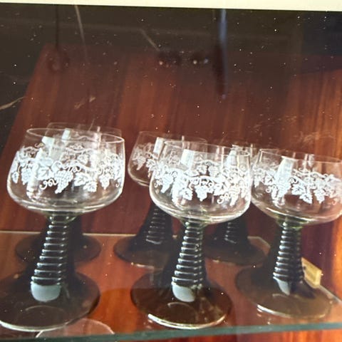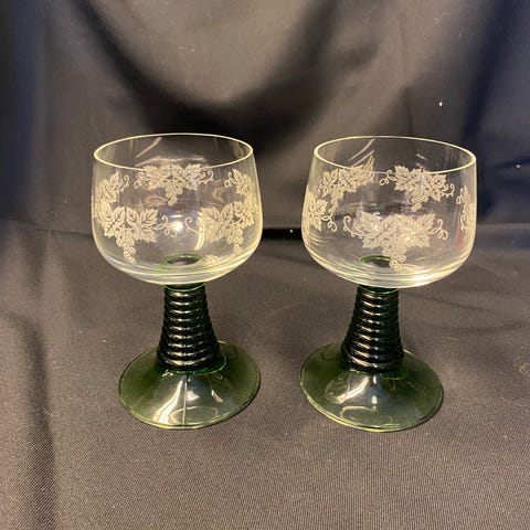 12 flotte Røhmer glass med sisselering. Nydelig klassisk grønn stett. Ingen skader. Fremstår som nye. Kan selges samlet eller i grupper av seks. Se bilder. Ca. 11,5 cm høye. 150,- per glass. Kan sendes om kjøper betaler porto