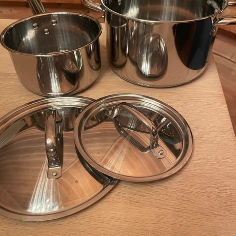 IKEA kasserollesett i rustfritt stål med glasslokk. Sett med tre gryter/kjeler i ulike størrelser, alle med håndtak og tilpassede lokk i glass med metallkant og håndtak.